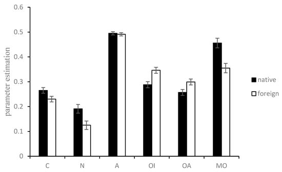 To examine whether the different methodologies interacted with the foreign/native condition on consequence and norm sensitivities (As there were four pairs of native–foreign samples, we checked whether the different sample pairs had different FLEs. If not, the four samples could be combined to achieve greater statistical power [22]. We conducted MANOVA with the parameters (C, N, A, OI, OA, and MO) as dependent variables, samples (samples 1~4) and language (native vs. foreign) as factors, and the level of language proficiency and understanding of the moral scenarios as covariates. The results showed that the different samples did not interact with the FLEs on any of the six parameters (F(3,621) ≤ 1.90, p ≥ 0.129, ηp2 ≤ 0.01). This means that there were no significantly different FLEs among the different samples. Thus, we combined the four samples to conduct the subsequent analysis), we conducted a MANOVA with the parameters (C, N, A, OI, OA, and MO) as dependent variables, language (native vs. foreign) as factors, and the level of language proficiency and understanding of the moral scenarios as covariates. The parameter estimations are shown in Figure 5, and the MANOVA results are shown in Table 3.