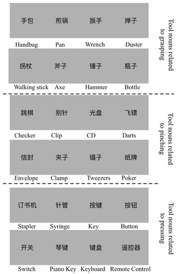 In recent years, the overlap and correlation of action and language cognitive processes has become one of the most critical research areas in cognitive neuroscience. The Action-Sentence Compatibility Effect (ACE) experiment [1] found that simultaneous language processing could modulate action planning and execution. Besides the findings from ACE, the interaction between language and motor systems has been found in neuroimage research. For example, functional magnetic resonance imaging (fMRI) studies have found that motion-related language could affect the neural activity in somatotopic regions of motor regions: the perception of verbs and sentences related to the hands, feet and mouth can trigger brain activation in corresponding regions of limbs [2,3,4]. Neuroimaging studies on the affordance of objects also found activation in the premotor cortex when participants read object nouns [5,6], suggesting that the motor codes related to object affordance are stored in the motor system, and the related motor codes are automatically activated while processing the object nouns. Neurophysiological studies also suggested that the action words caused neural activities close to the cortical representation of the body parts primarily used for carrying out the actions the verbs refer to [7,8].