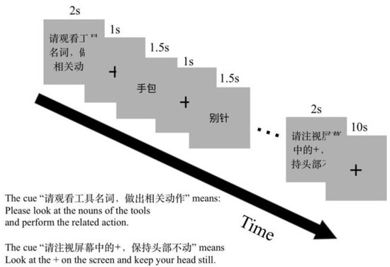 The orders of tasks and blocks in each run were counter-balanced. There were two runs in the experimental session. One run included twelve task blocks and twelve rest blocks. Action generation, verb generation and naming tasks each had four blocks. A visual prompt for the coming task was presented for 2 s before each task block, for example, “Please execute an action related to the presented object noun” (Chinese, “请执行物体名称相关动作”) for the NA task. Each task block comprised six trials. The stimulus presented for 1500 ms after a fixation cross for 1000 ms in a trail. One rest block lasted for 10 s. The experiment design is shown in Figure 2.