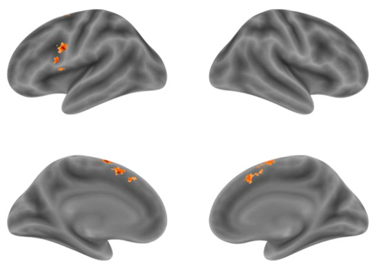 Activation for NA > NR was found in the bilateral Supplementary Motor Area (SMA), the left Superior Frontal Gyrus (SFG) and the Inferior Frontal Gyrus (IFG) (Figure 3a; Table 1). Activation for NV > NR was found in the bilateral Supplementary Motor Area and the left IFG (Figure 3b; Table 2). Activation for NA > NV was found in the left Precentral Gyrus, the bilateral SMA and the left Supramarginal Gyrus (Figure 3c; Table 3). The activation in the SMA was mostly located in the pre-SMA. However, no activation was found for NV > NA. According to these results, it can be preliminarily found that the brain activation is mainly biased to the left hemisphere in both action and verb generation tasks. The SMA and IFG were activated by both action and verb generation tasks. However, the activation of action generation in the Premotor Gyrus and Supramarginal Gyrus was significantly stronger than that of verb generation.