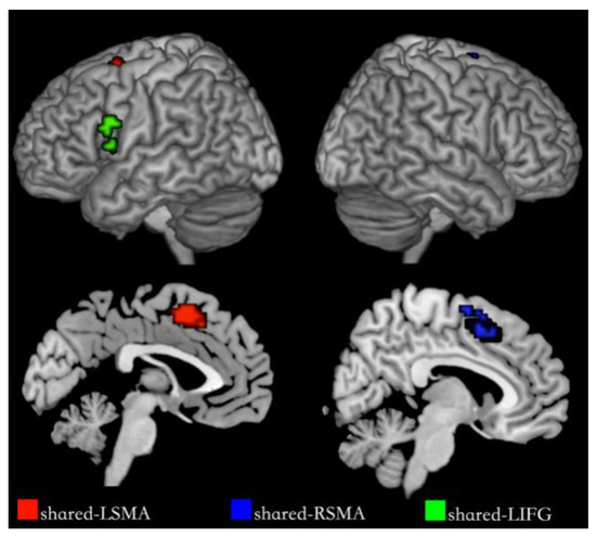 We analyzed the mean activation levels and multi-voxel patterns of the action and verb generation tasks in three shared ROIs. The results of the two analyses in the shared-LSMA and shared-RSMA were consistent, which showed different neural activity patterns in the two regions and a significantly higher activation level for action generation. In this study, the behavioral results of the participants’ actions and verb generation tasks were highly consistent with the predefined responses, indicating that the intention of generated actions and verbs was the same in both tasks. Thus, the difference in neural activity between action and verb generation with the same intention should be due to how the task is performed: actual execution and inner speech. Actual execution requires action control, and inner speech requires more lexical-semantic processing [48]. The different neural activity in the shared-LSMA and shared-RSMA suggest that these shared regions may be involved in action control and lexical-semantic processing in action and verb generation, respectively. This conclusion supports previous findings that the bilateral SMA is involved in motor control and language processing [38,40]. Since the shared regions in the bilateral pre-SMA were activated in both action and verb generation for tool nouns, it may be involved in encoding action intention. Moreover, in the comparison of mean activation levels, activation levels of these regions were significantly higher in action generation than in verb generation. A possible explanation for this might be that these regions are more inclined to action control than lexical-semantic processing.