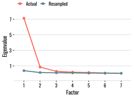 Actual and resampled eigenvalues from the parallel analysis. Note: Only the first 7 factors are shown for clarity.