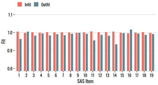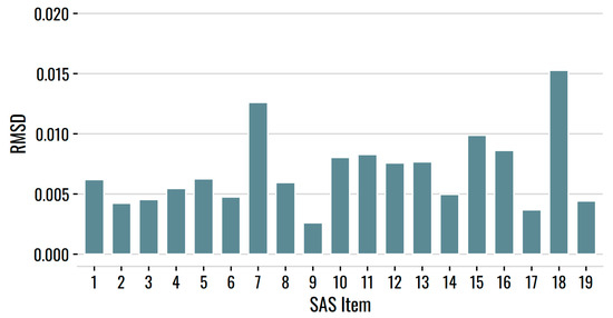 A limitation of Infit and Outfit statistics, however, is that they can become insensitive in large samples [30]. We thus also evaluated item RMSD, a fit statistic that evaluates deviations between the true and fitted item response functions. In their work, Köhler et al. [31] suggested RMSD misfit benchmarks of negligible (RMSD < 0.02), small (0.02 ≤ RMSD < 0.05), medium (0.05 ≤ RMSD < 0.08), and large (RMSD ≥ 0.08). As Figure 5 illustrates, item fit was excellent for all 19 SAS items. RMSD values were below 0.02 for all items, suggesting that item misfit was negligible.