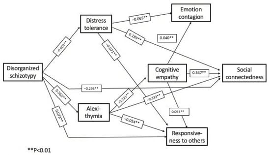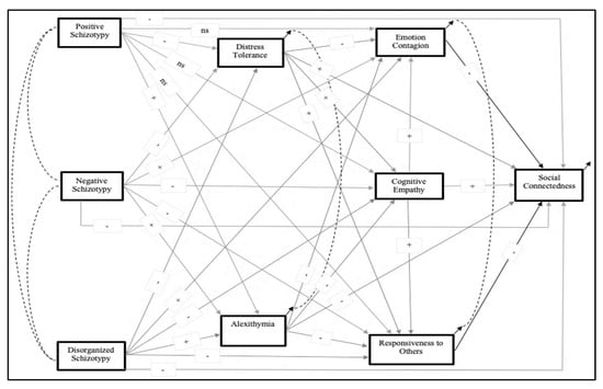 A small but significant unexpected and counterintuitive positive effect of positive schizotypy on social connectedness appeared, mediated by a direct effect on cognitive empathy. There was no direct effect of positive schizotypy on social connectedness, but there was a direct effect on responsiveness to others; although, that had no effect in turn on social connectedness. Negative and disorganized schizotypy also followed different pathways to social connectedness. All the valences of the path coefficients were in the expected direction, with two exceptions: negative schizotypy exerted a negative effect on emotion contagion through an indirect effect on alexithymia and cognitive empathy; and disorganized schizotypy had a net positive effect on responsiveness to others as a result of its strong impact on distress tolerance, reflecting increased sensitivity to others in distress. Although not hypothesized, the two exceptions are not counterintuitive, and consistent with previous findings on the complexity of interrelationships between measures of distress, emotion regulation, and sensitivity to others.