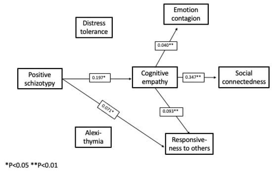 Of the three measures of empathy, cognitive empathy exerted a direct effect on social connectedness, but emotion contagion and responsiveness to others did not. The two empathy-related emotion regulation measures, distress tolerance and alexithymia, had different mediating roles in the respective schizotypy dimensions.