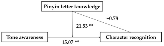 Moderation model of Chinese tone awareness, Pinyin letter knowledge, and character recognition. Note, ** p < 0.01.