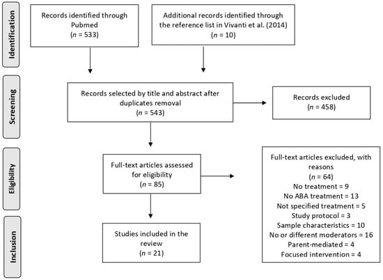 As shown in Figure 1, database searches produced 533 records, and 10 additional articles were selected from the reference list of a seminal paper by Vivanti et al. [17]. After the screening of titles and abstracts, 85 full-text articles were obtained for further analysis, and 21 articles met our inclusion criteria. Selected articles were primarily divided based on the method of identifying predictors of response treatment (whether correlational/regression analysis or responders profile analysis), then organized according to the class of predictors assessed (i.e., demographics, symptom severity, play, and social skills, cognitive functioning, communication, adaptive and maladaptive behaviors, developmental quotient, and emotional and psychiatric difficulties).