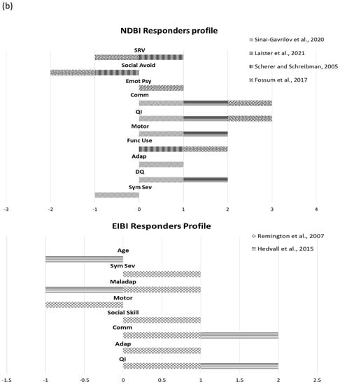 The current paper systematically reviewed studies on predictors and moderators of response to different types of evidence-based treatment for children with ASD, namely EIBIs and NDBIs. Specifically, our goal was to shed light on the relationships between pre-treatment child characteristics and specific treatment outcomes, covering different aspects of functioning (i.e., social, communicative, adaptive, cognitive, motor, global functioning, play, and symptom severity). Figure 2 summarizes the relationship between predictors and dependent variables (panel a) and the responders’ profile for the two treatment approaches (panel b).