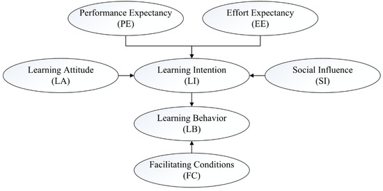 Reviewing the existing literature, it is found that there is a relative lack of research on the learning behavior of BIM technology from the perspective of individual students. In recent years, exploring BIM education from students’ perspectives has been encouraged. Agirbas [11] pointed out that students’ positive attitude towards using BIM software may improve their learning efficiency of professional architectural knowledge. In addition, through the evaluation of BIM learning achievement in China’s Sixth National BIM Graduation Design Innovation Competition of Colleges and Universities, Ao et al. [1] found seven public factors that affect BIM learning performance: (1) ability of the instructor, (2) school (college) atmosphere, (3) teamwork, (4) individual ability, (5) understanding of BIM industry applications, (6) social environment incentives, and (7) achievement demand. Furthermore, referring to the body of work that exists, this research combines the theory of UTAUT to analyze the influencing factors of college students’ BIM learning intention and behavior and their influencing relationships from the perspective of individual learners, aiming at exploring and developing the path of BIM education.