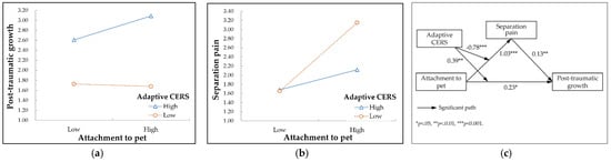 Moderating effect of adaptive cognitive emotion regulation strategy (CERS). (a) Moderating effect of adaptive CERS on the relationship between attachment to pet and post-traumatic growth after pet loss; (b) Moderating effect of adaptive CERS on the relationship between attachment to pet and separation pain after pet loss; (c) Research model with path coefficients.