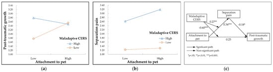 Moderating effect of a maladaptive cognitive emotion regulation strategy (CERS). (a) Moderating effect of a maladaptive CERS on the relationship between attachment to pet and post-traumatic growth after pet loss; (b) Moderating effect of a maladaptive CERS on the relationship between attachment to pet and separation pain after pet loss; (c) Research model with path coefficients.