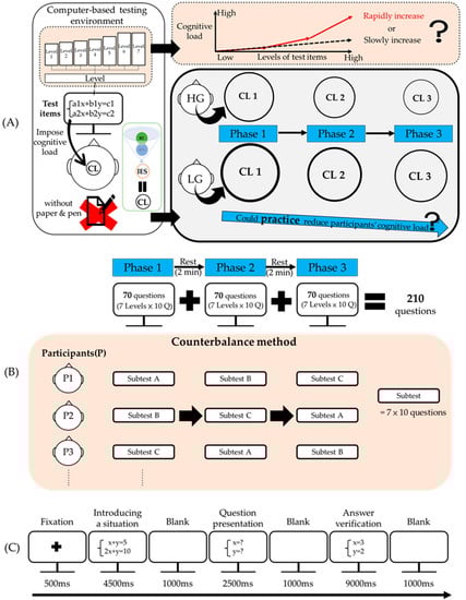 Research process. (A) Research structure. HG/LG refers to high- and low-efficiency. groups. CL refers to cognitive load. (B) The test administration procedure was divided into three phases. A counterbalance method was adopted to determine the order in which subtests should be administered. (C) The procedure for each test item.