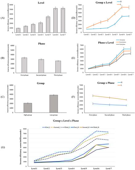 Results of three main effects (A–C), two-way interaction (D–F), and three-way interaction (G). (G) refers to the high- and low-efficiency groups’ IES of answering seven difficulty levels in three phases. The solid lines represent the IES of the high-efficiency group, and the dotted lines represent the IES of the low-efficiency group. The three phases are represented by different colors (first = blue line, second = orange line, and third = gray line).