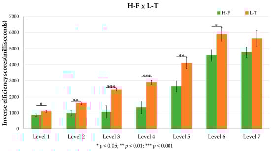 To further understand the practice effect, we conducted a mixed two-way ANOVA with G (H-F, L-T) as the between-subject factor, and L (L1 to L7) as the within-subject factor (Figure 3).