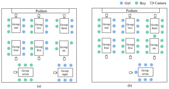 Before the start of the STEAM class, the research team placed a camera and a microphone in the best shooting position for each group and read out instructions to the participants, informing them that the activities in this STEAM class would be filmed but that their performance and learning outcomes would not affect their grades in the course. The group distribution in the classroom and the video recording position of the camera are shown in Figure 1.