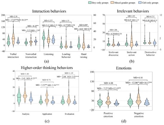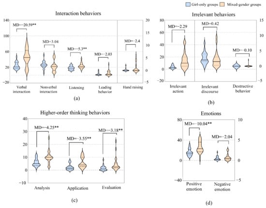 There were also many differences in how boys behaved in different types of gender grouping. The main results are shown in Figure 4. In terms of interaction behaviors, the boys in the mixed-gender groups engaged in more verbal interactions (MD = 17.53*, U = 178.500, Z = −2.477, p = 0.013) than those in the boy-only groups, but they listened less (MD = −6.22**, U = 161.000, Z = −2.823, p = 0.005) than those in the boy-only groups. There was no significant difference in nonverbal interaction, leading behavior, or hand raising. In terms of irrelevant behaviors, the boys in the mixed-gender groups demonstrated more irrelevant actions than those in the boy-only groups (MD = 8.99**, U = 155.500, Z = −2.933, p = 0.003), but there was no significant difference in irrelevant discourse or destructive behavior. In terms of higher-order thinking behaviors, the boys in the mixed-gender groups displayed more application (MD = 3.6**, U = 149.500, Z = −3.061, p = 0.002) and evaluation (MD = 3.33**, U = 168.500, Z = −2.681, p = 0.007) behaviors than those in the boy-only groups, but there was no significant difference in analysis behaviors. In terms of emotions, the boys in the mixed-gender groups exhibited more positive emotions, yet this difference was statistically insignificant. The boys in the mixed-gender groups exhibited more negative emotions than those in the boy-only groups (MD = 8.03***, U = 123.000, Z = −3.579, p = 0.000).