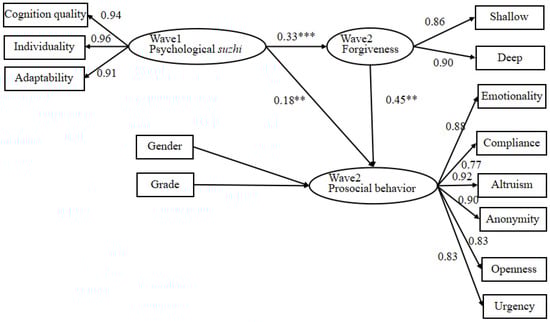 Structural Equation Model of the Continuous Effect of Psychological Suzhi on Prosocial Behavior in Wave 2 ( ** p < 0.01, *** p < 0.001).