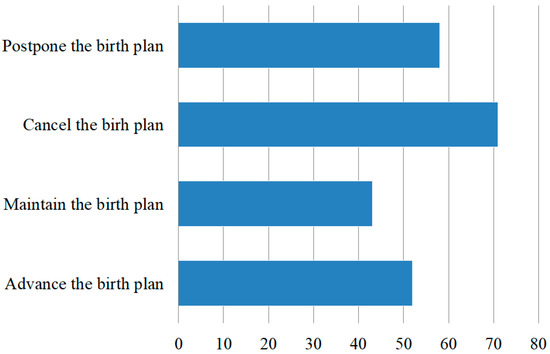 As shown in Figure 2, of the 443 respondents in this questionnaire survey, 224 had a birth plan three years before the epidemic, and 219 respondents did not have a birth plan. Among the 224 respondents with fertility plans, 23% advanced their fertility plans, 19.15% maintained their fertility plans, 31.5% canceled their plans, and 26.25% decided to postpone their plans. According to the results of changes in fertility intentions, it can be seen that COVID-19 had a significant impact on the fertility intentions of the female group, in which most of the women were pessimistic about childbirth and postponed or canceled their birth plans to different degrees.
