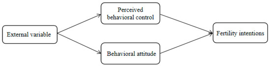 Section 2 mentions that economy, employment, health, and epidemic prevention policies impact women’s fertility intentions in the epidemic context. This section unifies issues such as health factors as a variable of perceived risk. Some variables that are usually studied in demographic analyses can be used as “external” variables in social psychological research [22]. TPB distinguishes two types of external variables: First, personal background factors, including income, education, and the number of born children while deciding to have children, which may influence fertility intentions by affecting attitudes, subjective norms, and perceived behavioral control. Second, aspects of the environment, such as institutions that provide support for childcare or working parents, are described as actual controls, or actual enablers and constraints. Several studies have been conducted by national and international scholars on the external variables (namely, behavioral attitudes and perceived behavioral controls). Billari [23] showed that socioeconomic factors influenced attitudes, while economic factors and mental health influenced behavioral control. Lin et al. [24] confirmed that shared spousal responsibility and paternal care support can also enhance the control beliefs and behavioral attitudes of the population at the optimal age to conceive a child, especially women of childbearing age, and promote the formation of intentions to have another child. Zhou [25] showed that the social norms and pressures of having more children made gender discrimination in the labor market increase rather than decrease, and intensified the negative beliefs of professional women in control. Klobas [26] performed a comparative analysis of European and Asian countries, and found that young women in countries with higher levels of family- and child-friendly policy support were more likely to identify themselves with the ability to overcome fertility barriers, and their desire to give birth was higher. Yan and Zhang [27] argued that fertility policy significantly influences women’s fertility behavior through the mediator of fertility intentions. Tian [28] found via a survey of women of childbearing age in Shanghai that increasing investment in public childcare, improving the accessibility of public childcare, and providing high-quality social care support for infants and toddlers aged 0–3 years would effectively increase willingness to have children again.