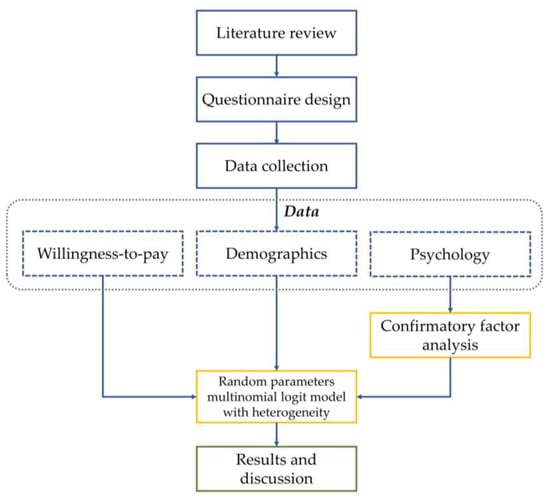 This study began with a literature review to identify research gaps and weaknesses discovered in previous research and investigate potential statistical methods and theories that could be applied to the WTP study. Next, we developed questionnaires based on review results and collected data from car drivers using face-to-face interviews. Then, two statistical methods (CFA and RPMNLHMV) were applied in sequence to achieve the objectives. First, CFA was used to confirm the measurement indicators of TPB and HAPA. Later, we inputted the WTP, demographics, and CFA results into a RPMNLHMV. Finally, we presented the statistics results and discussion. The research procedure is shown in Figure 3.
