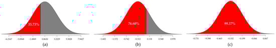 Table 6 also reveals that the significant indicators are random parameters of the models, finding that male drivers and attitude toward risk are random parameters for Low-WTP, and annual mileage is a random parameter of High-WTP drivers. The positive coefficient of the random parameters indicates that the majority of drivers are more likely to fall into the reference group, while the remainder represent other groups (negative coefficients are opposites). Figure 4 presents the proportion percentage between below and above zero of each random parameter (red representing the probability of below zero, and above zero is gray). This study also revealed that most male drivers have at least a Low-WTP, indicating a higher likelihood to pay, as males perceive that their driving behavior makes them a higher risk for accidents than females (consistent with results of Balakrishnan and Karuppanagounder [] and Yang, et al. [], who concluded that male drivers have a higher perception of their risk behavior, resulting in a higher WTP). Moreover, results from Andersson [] showed that female drivers were less likely to pay for safety improvement compared with male drivers. The attitude toward risk in this analysis has an extremely influential role, as drivers with high attitude scores also tend to have High-WTP. In contrast, low attitude scores could affect drivers’ Zero-WTP as well []. Evidence from the finding of Subhan, et al. [] reported that attitude toward traffic safety responsibility was found to be significantly associated with the intention to pay. Similarly, high annual mileage appears to be related to drivers’ preference for lower WTP for road safety. There are two possible reasons for this result. High mileage per year makes drivers more proficient and experienced, and the greater the distance, the greater the cost, resulting in a reduced WTP per trip. This is consistent with the finding of Yang, et al. [], who also found that highly experienced motorists tend to decrease WTP, as these groups of people are often more experienced and skilled, and they believe that life-threatening events can be avoided by themselves.