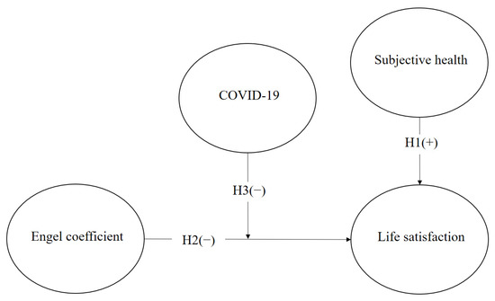 The Engel coefficient is the proportion of food expenditure out of all living expenditure [11,12,14]. A high Engel coefficient indicates lower quality of life because an insufficient budget is available for other areas of life: hobbies, education, clothes, etc. [12,13,31]. Thus, an individual’s needs for mental health and life quality are less likely to be satisfied with a high Engel coefficient. Previous works have discussed the Engel coefficient. Oh and Kim [32] found that a high Engel coefficient lowers life satisfaction. Qin et al. [33] examined the Chinese case, and their findings suggested that a high Engel coefficient is negatively associated with life satisfaction. Hence, it can be inferred that a higher Engel coefficient is likely to exert a negative impact on human life satisfaction. However, insufficient empirical works have explored the effect of the Engel coefficient on human life in the area of older adults. Considering the extant literature, this research thus proposes the following research hypotheses: