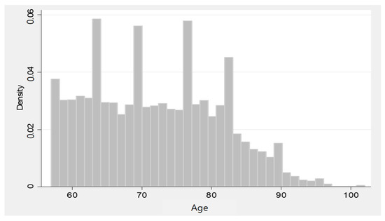 This study obtained the data using archival sources from the KLOSA. Many studies have adopted KLOSA as the source of information for studying senior citizens [19,20,21,43]. This fact implies that the data are credible for statistical inference. The Korea Employment Information Service performed a longitudinal study of the ageing project every two years; the organization reported the data every two years. The data collection was performed using surveys; computer-based, face-to-face interview was used for the data collection because it helps participants to control technology. The survey participant age criterion was older than 45 years old. Figure 2 illustrates the distribution of age information. The study period of this study is 2018–2020, which covers both the pre-COVID-19 and COVID-19 periods as the most updated information. Initially, this research implemented data cleaning; missing responses and refusal to respond were deleted from the sample. Thus, this study adopted 3879 (2018: 2011, 2020: 1868) observations for the data analysis. That is, the data appeared as an unbalanced panel in which the survey participants for both periods were not matched perfectly [44].