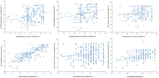 The scatter plot revealing the two-by-two correlations between the variables is shown in Figure 2. From the obtained result plot, we can quickly and visually find that the four variables involved in the study, organizational cultural tightness, transformational leadership, team-member exchange, and employees’ work engagement, show positive correlations between each of the two. From the slope of the fitted linear trend line and the correlation coefficients in Table 1, we can find that organizational cultural tightness is positively correlated with transformational leadership (r = 0.48, p < 0.01), team-member exchange (r = 0.46, p < 0.01), employees’ work engagement (r = 0.12, p < 0.05), transformational leadership with team-member exchange (r = 0.58, p < 0.01), employees’ work engagement (r = 0.20, p < 0.01), and team-member exchange with employees’ work engagement (r = 0.31, p < 0.01). The positive correlations are significant and provide the basis for further linear regression analysis and structural equation modeling later on.