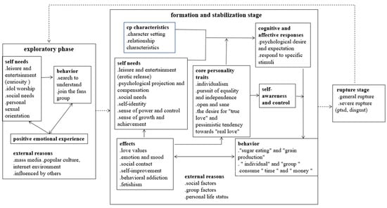 The development of shipping behavior can be divided into three stages: the exploration stage, the formation and stability stage, and the rupture stage. The CP fans’ cognition, behavior, and consequences in each stage can be different. In the exploratory stage, external factors have a great influence on individuals. Individuals are influenced by others around them or their social and cultural environment and begin to know a certain CP out of curiosity, entertainment, idolatry, or other mentalities.