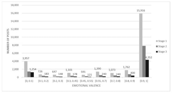 Emotions are expressed externally on social media platforms, spawning information dissemination behaviors [19]. Research on Facebook and Twitter has demonstrated that the sentiment of messages could trigger more cognitive involvement [20], which was correlated with retweeting, commenting, and liking [1,21]. People prefer retweeting posts that correspond to the emotional valence of the respective event [22]. User posts with prosocial emotions can trigger retweeting behavior [23]. Researchers found that commenting generally occurs more commonly with exposure to negative emotions [24]. Blog users prefer clicking likes for messages which convey emotions that correspond to the base emotion of an event. For example, a previous study found that cancer-related tweets with joy and hope received more likes [25].