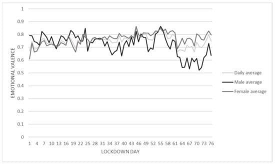 Emotional valence is an important concept, which generally refers to the experience of pleasant–unpleasant (positive–negative) feelings [2], reflecting people’s judgment on the value of information [3]. The pandemic impacts the emotional health of males and females differently. Although fewer women than men die from COVID [4], the employment situation and family life of women have suffered more in relation to men. For one, women constitute the majority of healthcare workers, and they bear the brunt of the virus in emergency rooms [5]. Women are also more vulnerable to losing their jobs due to layoffs or other reasons [6,7]. During quarantine and lockdown periods, women are the ones who take care of the increased chores in the household and care for family members [8]. Even the risk of domestic violence has risen as a result [7]. The increased workload at home and the poorer employment opportunities significantly worsen women’s emotional anxiety during the pandemic [9].
