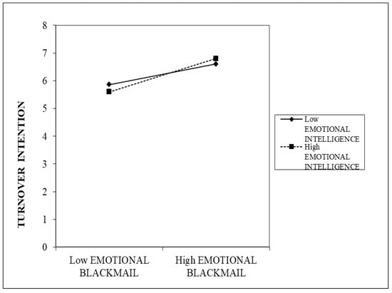 In Table 6, the moderating effect on turnover intentions did not include 0, which indicated H5 was significant. Following the conclusions of Cohen and Cohen [64], however, we examined the high and low values as plus and minus one standard deviation from the mean. The interaction is graphically displayed in Figure 2. The plots of the interaction terms showed that when there was a high level of emotional intelligence, the relationship between emotional blackmail and turnover intentions was stronger than the lower level. As a result, H5 was not supported. The results of the hypotheses are summarized in Table 7.