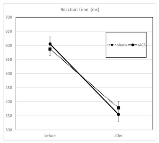 Reaction times in Luck–Vogel task before and after the intervention. The RTs were shortened in both groups post intervention, but the effect was not statistically significant. RT: reaction time; SD: standard deviation; SEM: standard error of the mean; tACS: transcranial-alternating current stimulation.