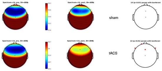 Power spectral density of low gamma activity at different electrodes in sham (upper pictures) and verum (lower pictures) tACS conditions. The left column shows pre-intervention, the middle column shows post–intervention, and the right column shows the comparison of the left and middle eons. Low gamma EEG activity differs at Fp1, F7, Fz, and F8 between pre- and “after” in the tACS group.