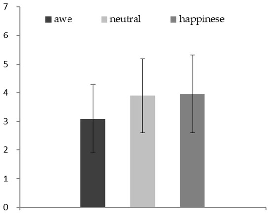The results of ANOVA showed that there was a significant difference in negative emotions arising from self-threat among the three groups (F (2, 174) = 10.93, p < 0.01, η2 = 0.11) (see Figure 2). Specifically, the participants in the awe condition (M = 3.08, SD = 1.19) reported lower negative emotions than those in the neutral condition (M = 3.90, SD = 1.29; F (1, 113) = 9.79, p < 0.01, η2 = 0.08) and in the happiness condition (M = 3.96, SD = 1.35; F (1, 115) = 14.69, p < 0.01, η2 = 0.11). No significant difference was found between the neutral and happiness conditions (F (1, 114) = 3.38, p = 0.07, η2 = 0.03).