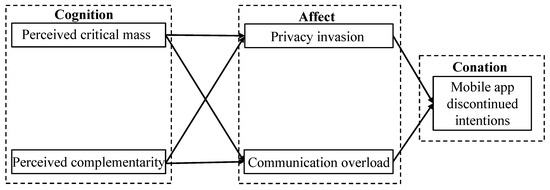 Cognitive load theory asserts that the effectiveness of learning and problem-solving declines when an individual requires additional cognitive resources to understand knowledge than they possess [46,47]. Moreover, overload is the primary element that hinders the utilization of information and communication technologies [11,24]. Overload may absorb users’ cognitive resources, resulting in negative emotions and inactive use. According to the cognition-affect-conation (CAC) framework, cognition is the process by which an individual forms a belief about the outside world; affect is the subjective feeling that an individual experiences while interacting with something or someone; and conation is the ultimate behavioral intention based on that individuals’ perception and psychological feeling [43,48]. In this investigation, users’ subjective cognition of the surrounding environment will have an effect on individual mood, which in turn will create conation. The article hypothesizes that users’ perceived critical mass and perceived complementarity impact communication overload and privacy invasion, which ultimately contributes to mobile app discontinued intentions. Figure 1 depicts the conceptual model according to the preceding study hypotheses.