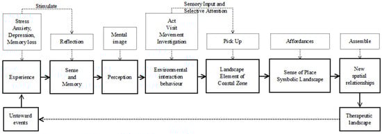 Human geographers and psychologists pay great attention to the interaction between people and the environment. No matter whether the words used are movements, acts, visits, or investigations, they are all seeking to adapt to the environment. The behavior change formed by reflection and memory from special experiences is characterized by the interaction between people and the environment. Under the stimulation of environmental behavior, people consciously pick up the landscape elements in the coastal zone to form a sense of place and a symbolic landscape with affordances; after a new spatial relationship is assembled, it becomes a therapeutic landscape and comes back to heal the wounds caused by the untoward event (Figure 1).