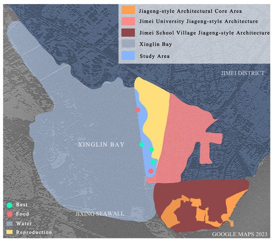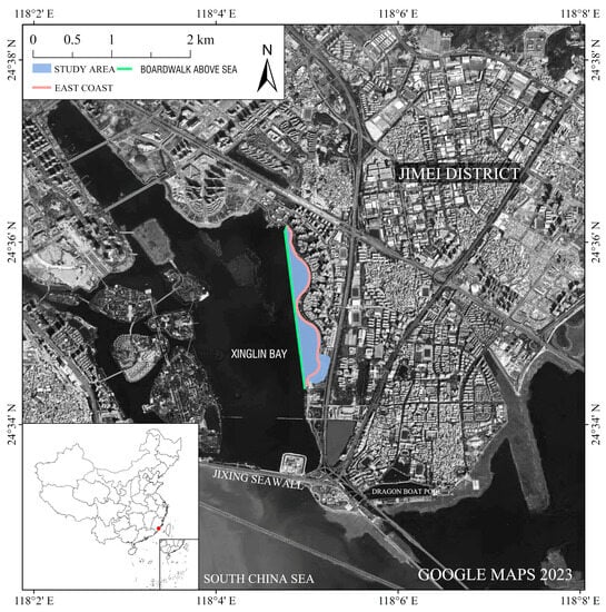Xinglin Bay is located in the center of the Jimei Cultural and Educational District of Jimei Peninsula, attracting a large population due to its educational resources [86]. It serves as a daily living space for Xiamen local residents. In 1979, the formation of a semi-enclosed water area occurred due to the construction of beach embankments, resulting in a unique characteristic of “half seawater, half freshwater” in the area. However, the rapid deterioration of the ecological environment took place as a result of industrial wastewater being discharged into Xinglin Bay from upstream industrial developments. Subsequently, Xiamen City actively promoted coastal tourism and placed emphasis on the scenic benefits of the natural environment, leading to efforts to restore the ecological landscape. During the restoration of the Xinglin Bay landscape belt, a strategy of natural succession as the primary approach, supplemented by human management was adopted [87]. This study focuses on the eastern coastal area of Xinglin Bay, including the boardwalk above the sea (for cycling and jogging), and the landscape belt on the east coast (with large grasslands, trails, water revetments, etc.), which spans a length of 2.6 km (Figure 2).