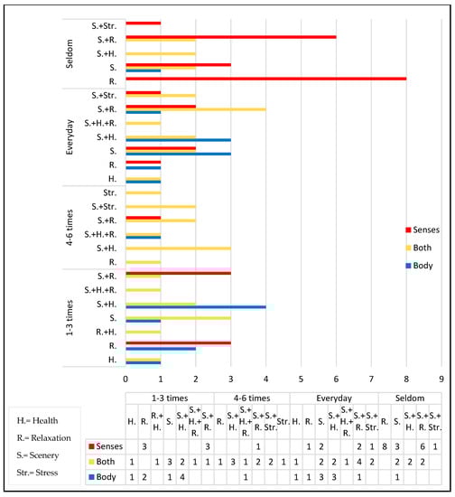 The visit frequency is categorized into four groups: “Seldom”, “1–3 times/week”, “4–6 times/week”, and “Everyday”. Among these categories, 71.2% of the total interviewees visited the coastal zone on a weekly basis. The “Seldom” visitors accounted for 28.7% of the total interviewees. The number of interviewees visiting “Everyday” was 27, which represents 31% of the total. The categories “1–3 times/week” and “4–6 times/week” accounted for 26.4% and 13.8% of the total, respectively.
