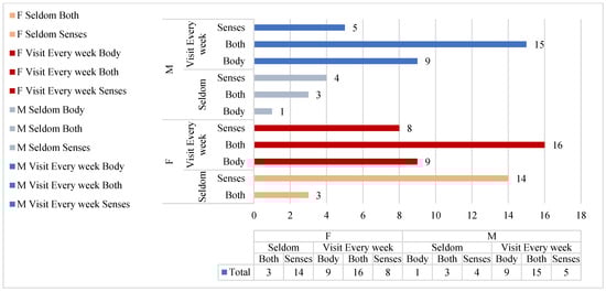 The cross-analysis table of visitation frequency and behaviors shows that the frequency of “Seldom” visits is 24, accounting for 27.6% of the total, while the frequency of “Visit Every week” visits is 63, accounting for 72.4%. The behavioral engagement of the “Visit Every week” visitors is significantly higher compared to the “Seldom” visitors. Within the “Seldom” frequency range, 17 individuals engage in sensory and environmental interactions, accounting for 70.8% of the total within the “Seldom” frequency category. Among the “Visit Every week” frequency group, 31 individuals simultaneously engage in sensory and body–environment interactions, representing 49.2% of the total “Visit Every week” frequency, nearly half of the population.