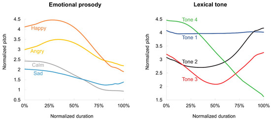 where X represents the observed F0, and H and L are the maximum F0 and minimum F0, respectively, of the speaker [64]. Figure 1 displays the normalized pitch contours of the emotional prosody and lexical tone stimuli, averaged across all speakers and tokens. The pitch contours of the lexical tone stimuli adhere to the canonical contour of the four lexical tones in Mandarin Chinese [65] and the pitch contours of the emotional prosody stimuli closely resemble those reported by Li [66].