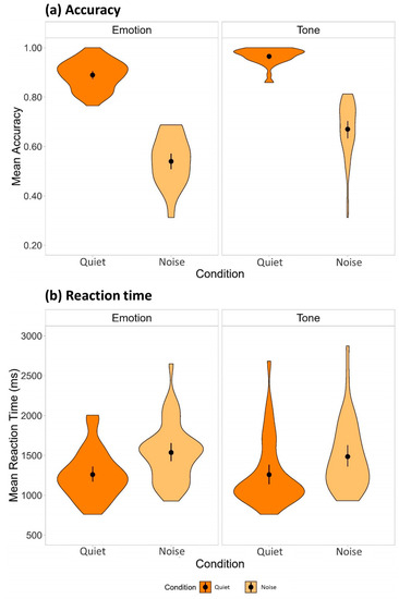 To compare the masking effects of babble noise on emotional prosody and lexical tones, we applied a series of generalized linear mixed-effects models in R (Version 4.1.3) with the lme4 package [68]. Accuracy and reaction time were entered as dependent variables, respectively. For the analysis of accuracy, binomial response data were used and a binomial distribution with a logit link function was employed. For the analysis of reaction time, a gamma distribution with a log-link function was implemented [69]. Before analyzing reaction time data, we preprocessed them by excluding incorrect responses and responses over 2 SDs from the mean [70,71]. Within-subject variables, task (emotion and tone) and listening condition (quiet and noise) were entered as categorical fixed factors. Speakers and items were included as a random intercept term to account for the subject- and item-level variability. Tukey’s post hoc tests in the emmeans package [72] were implemented for pairwise comparison when there was a significant main effect or interaction effect. p-values were obtained by likelihood ratio tests of the full model with the effect in question against the model without the effect in question. The full models with intercepts, coefficients, and error terms are, respectively, represented in Formulas (1) and (2) in Supplemental Material S1.
