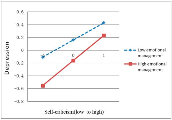 It has been tested that the interaction term of emotion management and self-criticism has a significant predictive effect on junior middle school students’ depressive emotions. To further understand the essence of this interaction, a simple slope test is needed to analyze the moderating effect of emotion management further. To form the high emotion management group, one standard deviation is added to the mean of emotion management. Conversely, to create the low emotion management group, one standard deviation is subtracted from the mean of emotion management. The simple slope test results are shown in Figure 3.