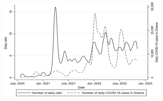 To answer the first goal of the present work, i.e., the potential relationship between the number of COVID-19 cases with the number of calls received by the L.H., the reported daily COVID-19 confirmed cases were retrieved from the National Public Health Organization (NPHO) [27].