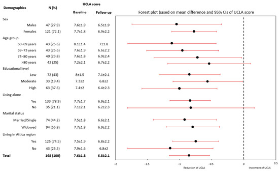Categorical variables are presented as relative frequencies (%) and continuous variables are presented as mean values (standard deviation). The association of UCLA-LS between baseline and follow-up was evaluated through Student’s paired t-test. Age classification into four groups was defined in accordance with quartiles. Sub-group analysis of UCLA-LS between baseline and follow-up was utilized by age, sex, educational level (low, medium, high), area of residence, cohabitation and marital status.