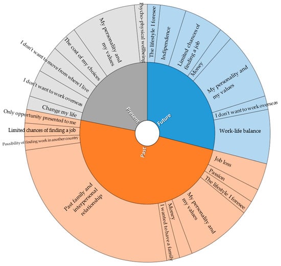 Data analysis started with data coding. Coding means labeling and creating data categories within the data set. This step was facilitated in the case of the MSCI because within the diagram, the participants’ choices were already coded in keywords. Some codes, however, could be superimposed on each other. The advantage of reviewing these encodings using NVivo 12 is that it allows further sorting of the encoded data through the “nodes’’ tool. The software gives the possibility to identify two types of nodes: main nodes and subnodes. In our case, the analysis was conducted taking into account three main nodes: past, present, and future. This allowed us to include subnodes in each node, contextualizing them according to the time perspective, consistent with what is reported in the introduction.