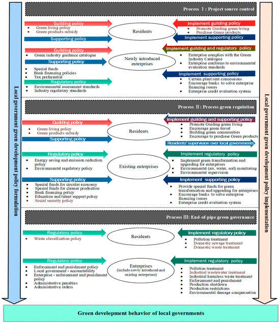Policy implementation requires government actors to manage and implement the policy [41], including various actions, interpretation, dissemination, experimentation, coordination, and control. Although the above studies describe green development policymaking, policy formulation to implementation would probably not be easy. First, implementing development behaviors is a dynamic process that denotes the transformation of policy content into practical effects to achieve the stated goals of the policy. It also means moving from the previous model of pursuing only economic growth to the model of pursuing green development. Second, process research in organizational theory suggests that organizations cannot simply replicate processes that work effectively in other organizations [33]. Understanding how processes are achieved requires insights into the sequence of events that occur over time [43]. The third, rational choice, institutionalism, proposes that different green development behaviors should be implemented according to the key stakeholders in the process of implementing green development behaviors [41]. Finally, since implementing green development behaviors in local governments involves the assistance of multiple departments, local government officials usually act upon what they believe is appropriate for their roles and specific policy sectors [40]. Therefore, this section highlights the key processes and practices of local government departments in implementing green development behaviors when interacting with the public and businesses, including source project control, process green regulation, and end-of-pipe green governance.