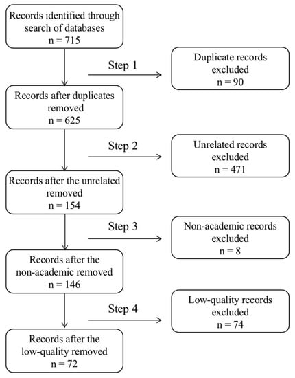 Step 4: 74 low-quality papers were excluded, with the remaining 72 left. By carefully reading all the relevant and academic articles, we identified and removed those articles with unclear arguments and poor argumentation processes.