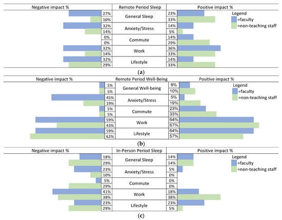 During the return to in-person work, both faculty and non-teaching staff reported more negative than positive sleep and well-being outcomes. In particular, during the in-person period, faculty members were found to have slightly more negative sleep outcomes related to anxiety and work, while staff members revealed slightly more negative sleep outcomes related to the need to commute and lifestyle.
