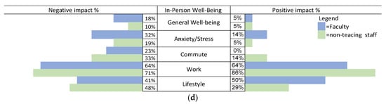 Negative well-being experiences during the in-person period. Again, the participants, especially faculty, had more negative than positive responses related to anxiety/stress. They also pointed to many negative, as well as positive, work- and lifestyle-related impacts on their well-being.